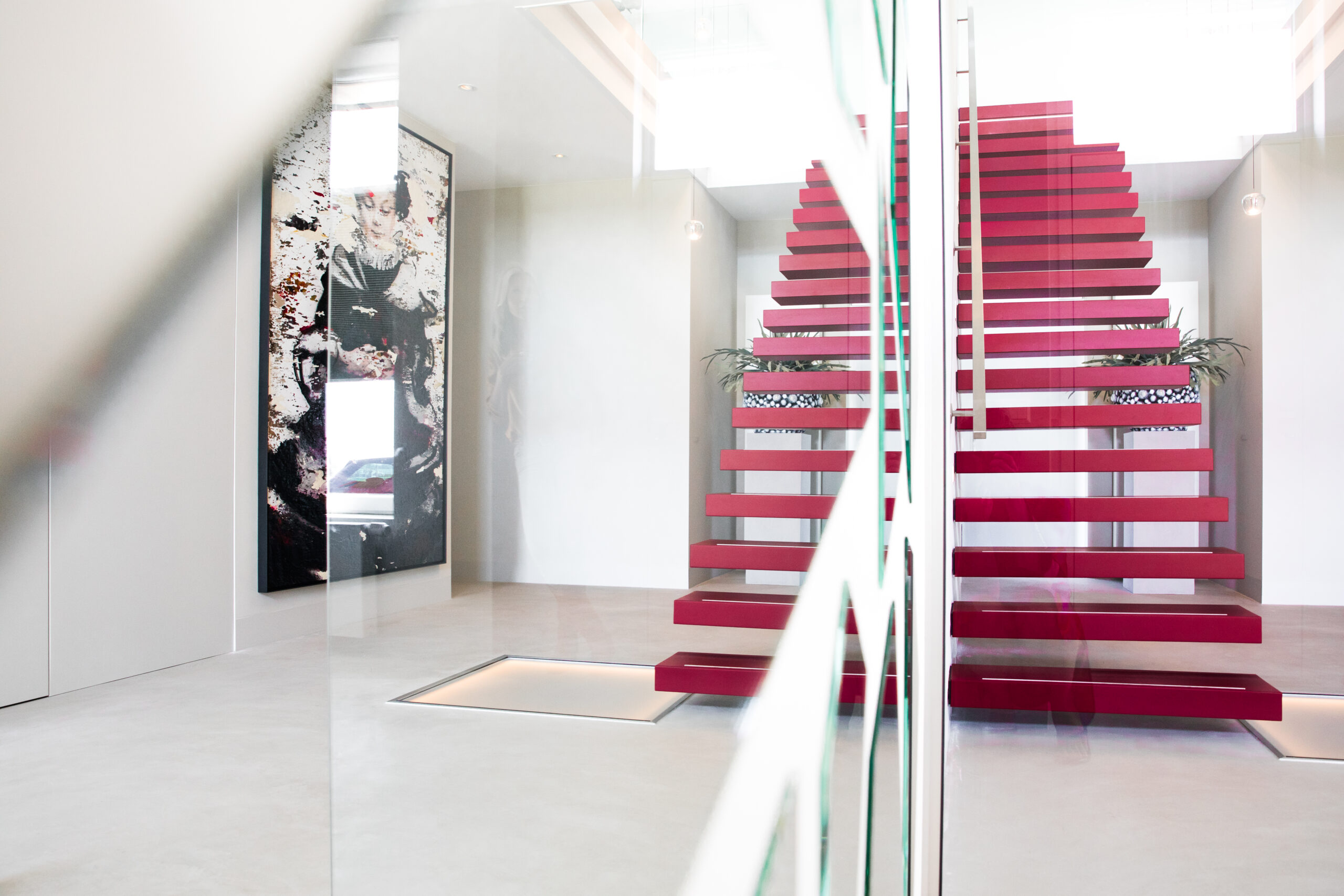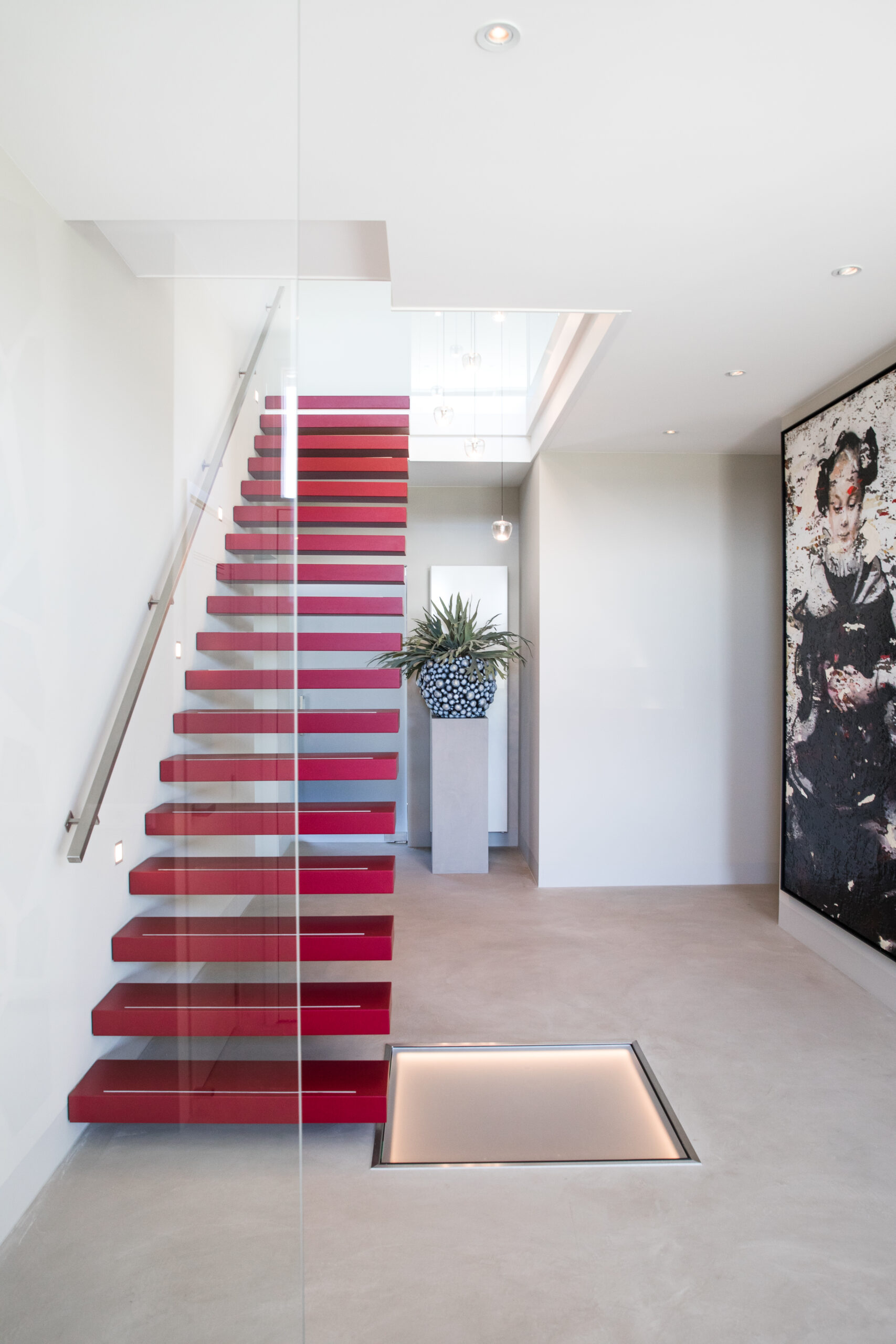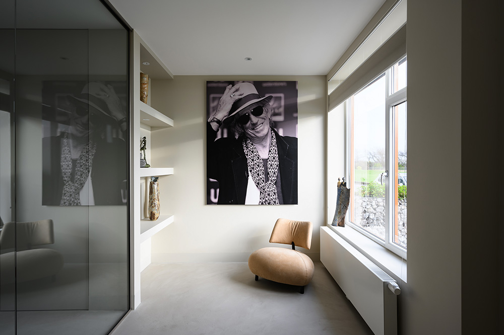 Studio SK ontwierp de totaal nieuwe indeling, rekeninghoudend met de specifieke wensen van de klant: een moderne, maar warme sfeer, een zwevende trap, een haard en een aan het oog onttrokken lift. Ook wilde de klant dat een al aangeschaft schilderij van alle kanten zichtbaar moest zijn. De oplossing: een doorkijkhaard. Studio SK verzorgde ook de inrichting van de woning: nieuwe meubelen, vloeren, raambekleding, verlichting, accessoires en kunst. Tijdens de verbouwperiode waren wij dagelijks betrokken bij het project, in nauwe samenwerking met de aannemer en klant.