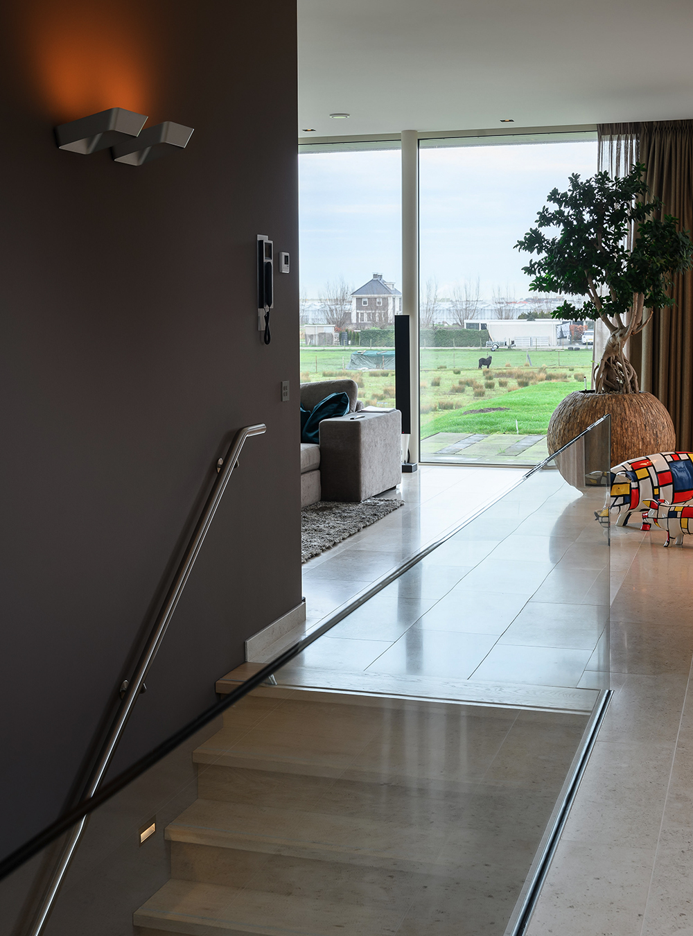 In opdracht van een klant in ‘s-Gravenzande heeft Studio SK de complete inrichting verzorgd van een nieuwe, luxueuze villa. Van het lichtplan, de indeling en de materialen tot en met het kleurenplan en stoffering. Het eindresultaat is een moderne, sfeervol ingerichte villa met warme tinten. De benedenverdieping is voorzien van een zwembad met wellness en bioscoop/barruimte. De vloeren in het zwembad en woonruimte zijn voorzien van natuursteen. De wanden in drie badkamers zijn voorzien van glasmozaïek en de slaapverdiepingen zijn verrijkt met vloerdelen van gerookt eiken. De villa heeft een ommanteling van Corian, wat een zeer luxe uitstraling geeft.